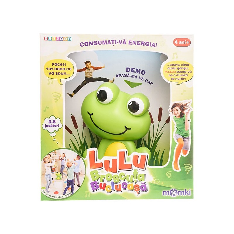 Jocul interactiv – Lulu, Broscuta Buclucasa, un joc potrivit pentru a petrece clipe minunate alaturi de cea mai buna prietena a copiilor, o broscuta numita Lulu. Lulu - broscuta buclucasa propune 50 de activitati distractive, pentru ca cei mici sa isi foloseasca imaginatia si sa isi consume energia intr-un mod placut. Copiii trebuie sa asculte ceea ce broscuta le spune sa faca. Printre activitatile propuse de broscuta Lulu se numara: “Sunteti canguri!”, “Sunteti astronauti pe o planeta indepartata!”, “Este timpul pentru o plimbare calare!”, “Faceti tot ceea ce va spun….”, “atunci cand auziti gongul… Repede! Duceti-va pe o frunza de nufar!” Printre altele concurentilor s-ar putea sa li se solicite sa imite sunetul avionului, sa imite animalul preferat, sa topaie sau sa faca diverse alte activitati. Scopul jocului este acela de a obtine cat mai multe stampile pe brate sau pe maini. In interiorul cutiei veti gasi: broscuta buclucasa Lulu, 5 frunze de nufar, 1 stampila pentru marcarea punctelor si o fisa cu intructiuni. Jocul contribuie la imbunatatirea abilitatilor sociale, de comunicare, memorie si concentrare. Numari de jucatori: 3-6 jucatori. Produsul este recomandat copiilor cu varsta mai mare de 4 ani. Pentru a curata produsul, se recomanda utilizarea unei lavete umede.