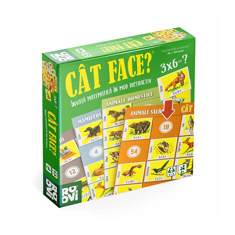 Joc educativ - Cat face?, un joc ce face parte din seria jocurilor romanesti proiectate si fabricate in Romania. Jocul a fost inventat si ilustrat de Ioan Nicolau, cunoscut pentru jocul Animale din continente. Cu acest joc dinamic de societate si de matematica, copiii fac exercitii de inmultire si impartire in mod distractiv, imbogatindu-si totodata cunostintele despre animale. Numar de jucatori: 2-5. Jocul contine: 4 planse de joc, 48 carti de joc, regulamentul de joc. Jocul este contraindicat copiilor mai mici de 3 ani. Se recomanda utilizarea produsului de catre copiii mai mari de 8 ani. Produsul poate fi curatat cu o carpa moale, uscata. Se recomanda ferirea produsului de umezeala si caldura excesiva. Produsul este fabricat in Romania in conformitate cu reglementarile EN71.