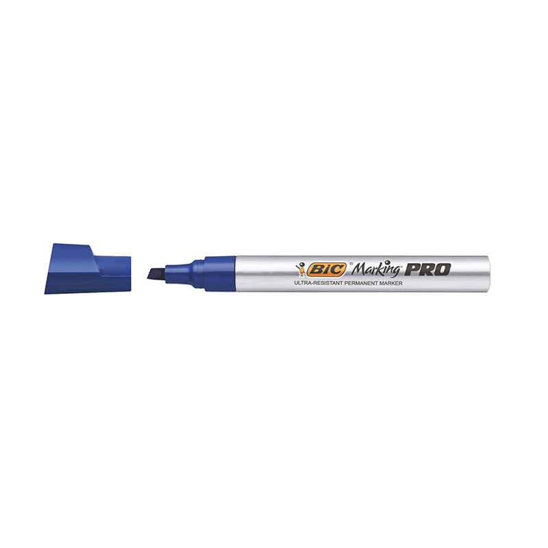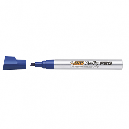 Marker permanent Bic Marking Pro, un marker permanent de culoare albastra, cu varful tesit, ce poate fi utilizat pentru orice suprafata: hartie, carton, sticla, platic, metal, lemn, etc. Markerul foloseste o cerneala cu uscare rapida, ultra rezistenta, care persista chiar si in conditii extreme: temperaturi intre -30 si +150 grade Celsius, si este rezistenta la apa. Corpul cilindric al markerului permite un scris sigur si rapid. Corpul markerului este realizat din aluminiu si este rezistent la lumina si diferite conditii meteo. Markerul este prevazut cu un capac in culoarea cernelii, avand o forma care impiedica rostogolirea markerului. Varful markerului este realizat din acril, foarte rezistent si fix, nu se indoaie si nu se retrage sub presiune. Linia de scriere este de 1,7-4,7 mm. Ambalare: 12 bucati/cutie.