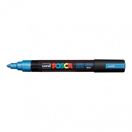 Markerul Posca PC-5M este cel mai universal si versatil produs din gama Posca. Linia curata, clara si precisa, precum si acoperirea perfecta a culorilor i-au permis sa castige o multime de suporteri printre profesionisti si amatori. Vopseaua de marker este opaca, fluida, neteda, densa si are o putere mare de acoperire. Poate fi amestecat, diluat si aplicat in straturi. Rezultatele sunt similare cu cele care se pot obtine cu vopseaua acrilica. Culorile pot fi amestecate direct pe suport atata timp cat vopseaua este inca umeda. Datorita timpului scurt de uscare, se pot aplica straturi succesive minut cu minut. Culorile deschise pot fi aplicate peste cele inchise fara teama. Vopseaua poate fi diluata pentru a obtine un efect de gradare a culorii, adica estompare. Principalele avantaje ale markerelor Posca sunt urmatoarele: cerneala nu se inmoaie prin hartie, produsul nu este toxic (poate fi folosit pentru vopsit pe corp), culorile diferite nu se combina dupa ce se usuca cerneala, rezistent la lumina si conditiile meteorologice, cerneala pigmentara unica pe baza de apa. Sunt potrivite pentru scris pe materiale precum: sticla, metal, lemn, plastic, stofa, portelan, teracota, hartie, lemn si chiar pe corp. Cine poate folosi markere Posca? Acest produs se adreseaza in primul rand: artistilor, artistilor graffiti, arhitectilor si designerilor, mestesugarilor pasionati de decorarea obiectelor sau realizarea decoratiunilor interioare, surferilor si skaterilor care isi doresc o “fata” noua pentru placile lor, studentilor si copiilor de toate varstele! Este perfect pentru uz profesional, potrivit pentru iubitorii de artizanat, in special scrapbooking si crearea de felicitari, pentru realizarea finisajelor, detaliilor si contururilor. Datorita markerelor Posca, puteti proiecta un tricou sau o sapca cu vizor - doar calcati materialul si modelul va fi durabil. Produsul poate fi folosit si pentru a decora vitrine, instrumente muzicale, echipamente sportive sau chiar o masina! Cum poate fi pastrata culoarea? Supraacoperire cu lac incolor pentru sticla, plastic, metal, lemn, hartie sau teracota; foc in cuptor la aproximativ 180° C pentru produse ceramice si fierul de calcat pentru materiale textile. Markerul este disponibil pe varianta de culoare albastru metalizat.