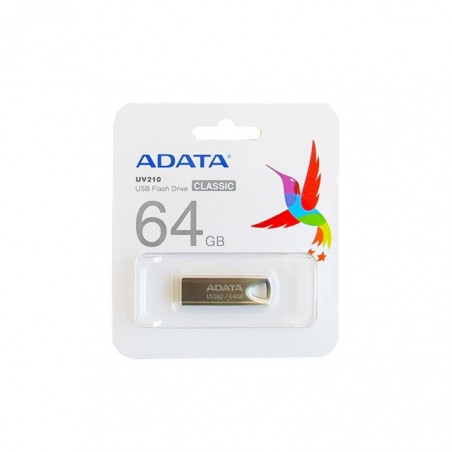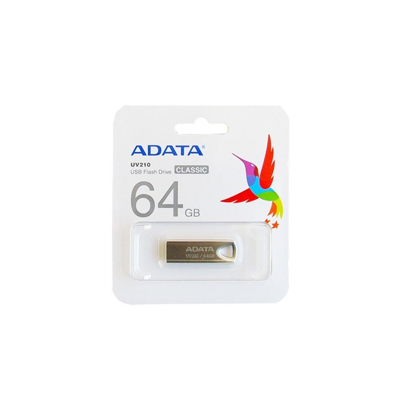 Adata UV210 2.0 este o unitate flash USB tip A de culoare gri, ce ofera un spatiu de 64 GB ideal pentru stocarea de muzica, imagini, filme sau documente. Carcasa unitatii USB Adata UV210 este realizata din metal, fiind rezistenta la zgarieturi si murdarie. Datorita designului fara capac si formei compacte, aceasta unitatea flash poate fi atasata cu usurinta la breloc, geanta sau chiar purtata la gat. Adata UV210 este compatibil cu porturile USB 2.0. Dimensiuni: 39x12.2x4.5 mm.