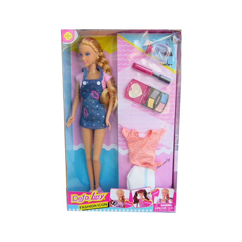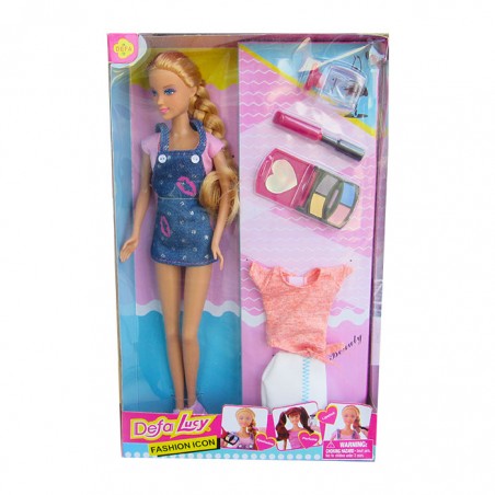 Papusa Defa Lucy este o papusa deosebita, care va aduce multa bucurie si veselie copiilor, devenind cea mai buna partenera de joaca a acestora. Copiii pot invata cum sa aiba grija de papusa, sa o plimbe, sa o hraneasca, sa o schimbe de hainute sau sa o puna la somn. Jocul cu papusa contribuie la dezvoltarea comunicarii, imaginatiei si responsabilitatii, si imbunatateste motricitatea fina, coordonarea si dezvoltarea emotionala a copiilor. Papusa Defa Lucy poarta un sarafan si un tricou asortat. Papusa are un set de haine de schimb. Cutia contine diverse accesorii, precum: un set de farduri, un ruj, o sticluta de parfum. Papusa are ochii mari si expresivi, de culoare albastru, si parul blond. Lungimea papusii este de aproximativ 29 cm. Dimensiunile cutiei sunt urmatoarele: 31x19x5 cm. Pentru a curata papusa, se recomanda folosirea unei lavete umede. Produsul nu este recomandat copiilor mai mici de 3 ani. Se recomanda utilizarea produsului de catre copiii mai mari de 3 ani.