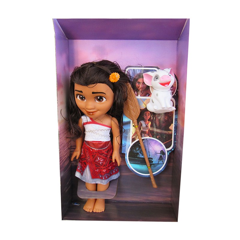 Papusa Moana este o papusa deosebita, care va aduce multa bucurie si veselie copiilor. Copiii pot invata cum sa aiba grija de papusa, sa o plimbe, sa o hraneasca, sa o schimbe de hainute sau sa o puna la somn. Jocul cu papusa contribuie la dezvoltarea comunicarii, imaginatiei si responsabilitatii, si imbunatateste motricitatea fina, coordonarea si dezvoltarea emotionala a copiilor. Papusa este imbracata intr-o rochita comoda. Cutia contine si urmatoarele accesorii: o vasla si celebrul porcusor. Dimensiunile cutiei sunt urmatoarele: 39x25x9 cm. Pentru a curata papusa, se recomanda folosirea unei lavete umede. Produsul nu este recomandat copiilor mai mici de 3 ani. Se recomanda utilizarea produsului de catre copiii mai mari de 3 ani.