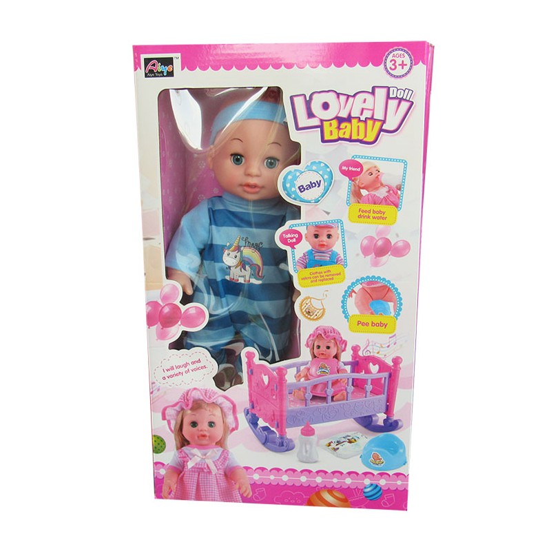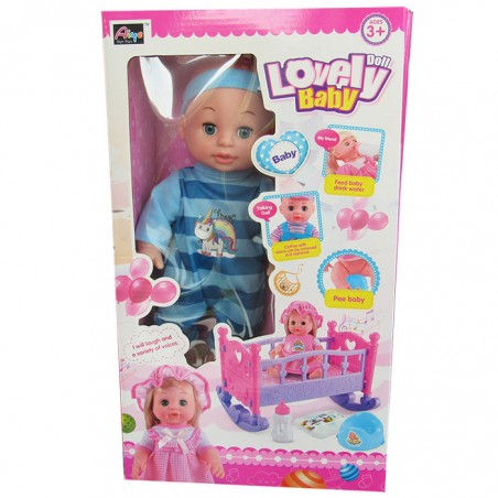 Papusa bebe este o papusa deosebita, care va aduce multa bucurie si veselie copiilor. Copiii pot invata cum sa aiba grija de papusa, sa o plimbe, sa o hraneasca, sa o schimbe de hainute, sa o puna la somn si sa o consulte. Jocul cu papusa contribuie la dezvoltarea comunicarii, imaginatiei si responsabilitatii, si imbunatateste motricitatea fina, coordonarea si dezvoltarea emotionala a copiilor. Papusa este imbracata intr-o salopeta de culoare albastra, si poarta o bentita asortata. Cutia contine si un patut, astfel incat jocul sa fie complet. Papusa functioneaza cu 3 baterii AG13. Dimensiunile cutiei sunt urmatoarele: 41x24x15.5 cm. Pentru a curata papusa, se recomanda folosirea unei lavete umede. Produsul nu este recomandat copiilor mai mici de 3 ani. Se recomanda utilizarea produsului de catre copiii mai mari de 3 ani.