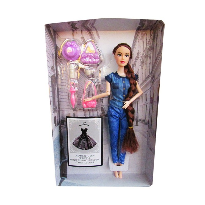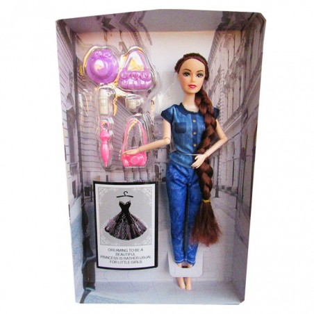 Papusa cu accesorii va deveni cea mai buna prietena a micutei dumneavoastra, oferindu-i momente pline de distractie si veselie. Jocul cu papusa contribuie la dezvoltarea comunicarii, imaginatiei si responsabilitatii, si imbunatateste motricitatea fina, coordonarea si dezvoltarea emotionala a copiilor. Papusa este imbracata in panataloni si tricou asortat. Papusa are parul lung, brunet, impletit intr-o codita, si permite realizarea a diferite coafuri. Cutia contine si diverse accesorii precum: o geanta, un aparat foto, o cana, o sticla de apa, o umbrela si o palarie. Lungimea papusii este de aproximativ 29 cm. Dimensiunile cutiei sunt urmatoarele: 32.5x20x5.5 cm. Pentru a curata papusa, se recomanda folosirea unei lavete umede. Produsul nu este recomandat copiilor mai mici de 3 ani. Se recomanda utilizarea produsului de catre copiii mai mari de 3 ani.