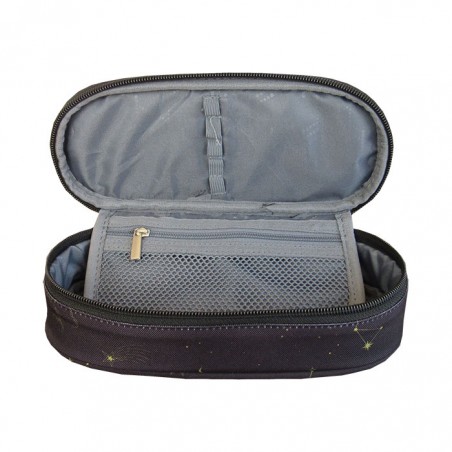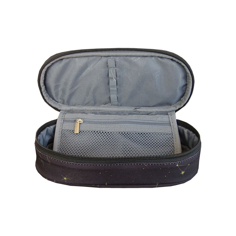 Penar borseta 1 compartiment, 1 extensie, oval, Majewski, Colectia Night Cats, un penar compact, dar spatios in acelasi timp. Penarul este realizat dintr-un material textil, rezistent si impermeabil. Penarul are o forma ovala ergonomica si este prevazut cu doua fermoare rezistente. Penarul dispune de o capacitate mare de echipare, oferind suficient spatiu pentru diverse rechizite: rigla, ascutitoare, compas, instrumente de scris sau instrumente de colorat. Penarul este dotat cu o extensie, care este prevazuta cu elastice pentru fixarea instrumentelor de scris, precum si cu un buzunar interior ce se inchide cu fermoar. Dimensiunile penarului sunt urmatoarele: 20.5x9.5x5 cm.