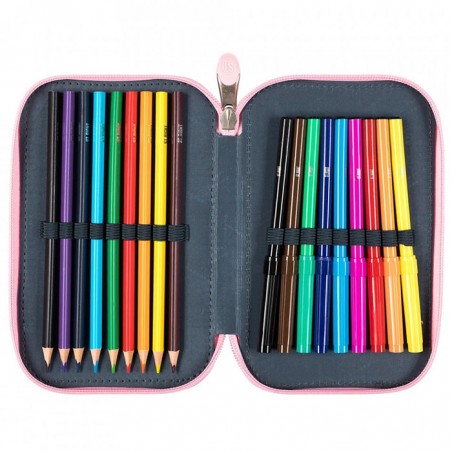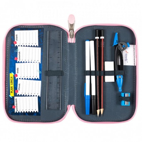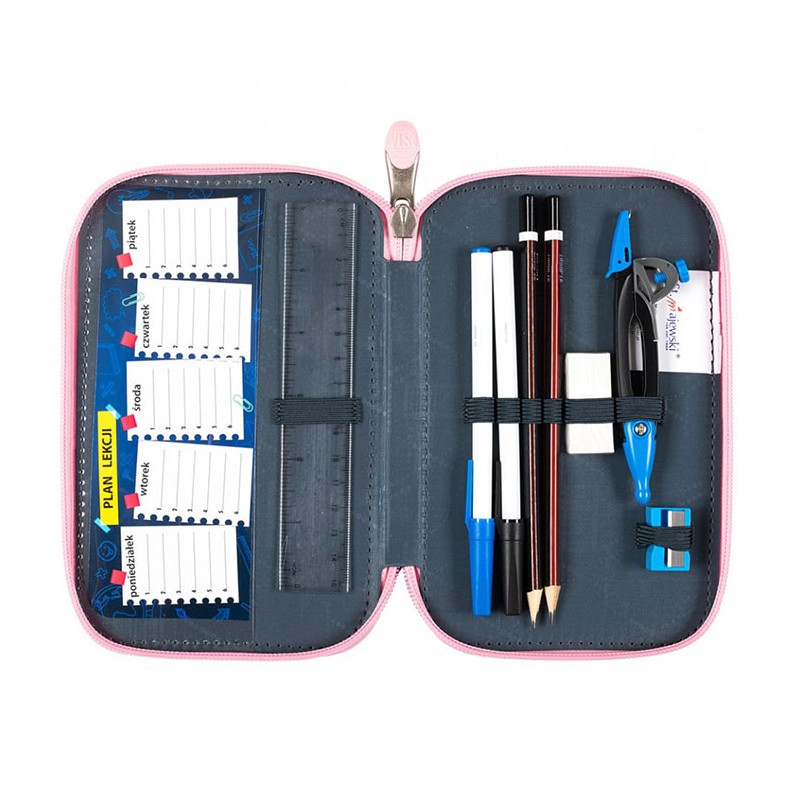 Penar echipat, prevazut cu 2 fermoare, Majewski, Colectia Grey Panda, un penar compact si spati-os. Penarul este realizat dintr-un material textil, de foarte buna calitate, rezistent si impermeabil. Penarul este prevazut cu doua compartimente si dispune de o capacitate mare de echipare, oferind suficient spatiu pentru diverse rechizite. Penarul este echipat cu urmatoarele rechizite: 1 rigla de 15 cm, 1 radiera, 1 ascutitoare, 9 carioci, 9 creioane colorate, 2 creioane grafit, 1 compas, 1 pix cu cerneala albastra si 1 pix cu cerneala neagra. Penarul este dotat si cu un orar. Fermoarele penarului sunt rezistente, dotate cu o zona de prindere din plastic si profilata, pentru prindere usoara. Di-mensiunile penarului sunt urmatoarele: 21x12.5x4.5 cm.
