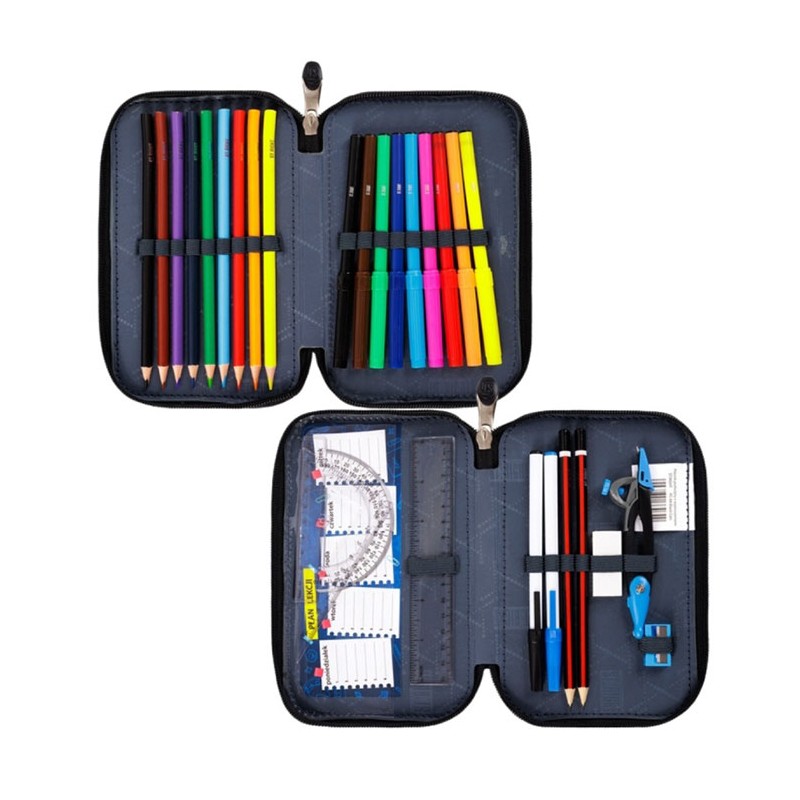 Penar echipat, prevazut cu 2 fermoare, Majewski, Colectia Neon Football, un penar compact si spatios. Penarul este realizat dintr-un material textil, de foarte buna calitate, rezistent si impermea-bil. Penarul este prevazut cu doua compartimente si dispune de o capacitate mare de echipare, oferind suficient spatiu pentru diverse rechizite. Penarul este echipat cu urmatoarele rechizite: 1 rigla de 15 cm, 1 radiera, 1 ascutitoare, 9 carioci, 9 creioane colorate, 2 creioane grafit, 1 compas, 1 pix cu cerneala albastra si 1 pix cu cerneala neagra. Penarul este dotat si cu un orar. Fermoarele penarului sunt rezistente, dotate cu o zona de prindere din plastic si profilata, pentru prindere usoara. Dimensiunile penarului sunt urmatoarele: 21x12.5x4.5 cm.