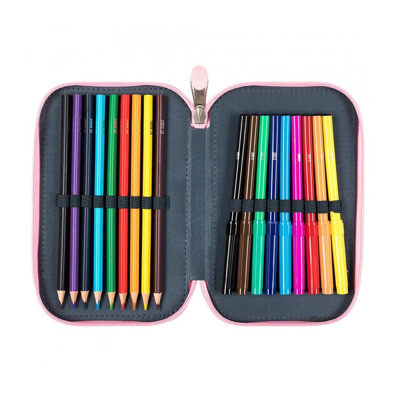 Penar echipat, prevazut cu 2 fermoare, Majewski, Colectia Grey Panda, un penar compact si spati-os. Penarul este realizat dintr-un material textil, de foarte buna calitate, rezistent si impermeabil. Penarul este prevazut cu doua compartimente si dispune de o capacitate mare de echipare, oferind suficient spatiu pentru diverse rechizite. Penarul este echipat cu urmatoarele rechizite: 1 rigla de 15 cm, 1 radiera, 1 ascutitoare, 9 carioci, 9 creioane colorate, 2 creioane grafit, 1 compas, 1 pix cu cerneala albastra si 1 pix cu cerneala neagra. Penarul este dotat si cu un orar. Fermoarele penarului sunt rezistente, dotate cu o zona de prindere din plastic si profilata, pentru prindere usoara. Di-mensiunile penarului sunt urmatoarele: 21x12.5x4.5 cm.