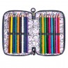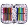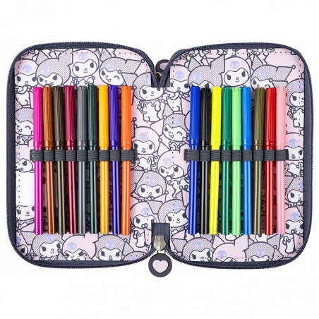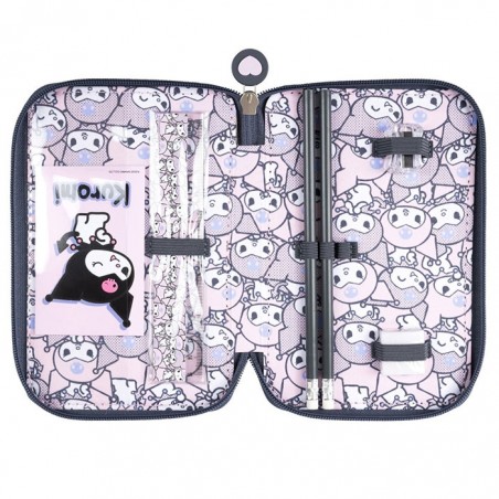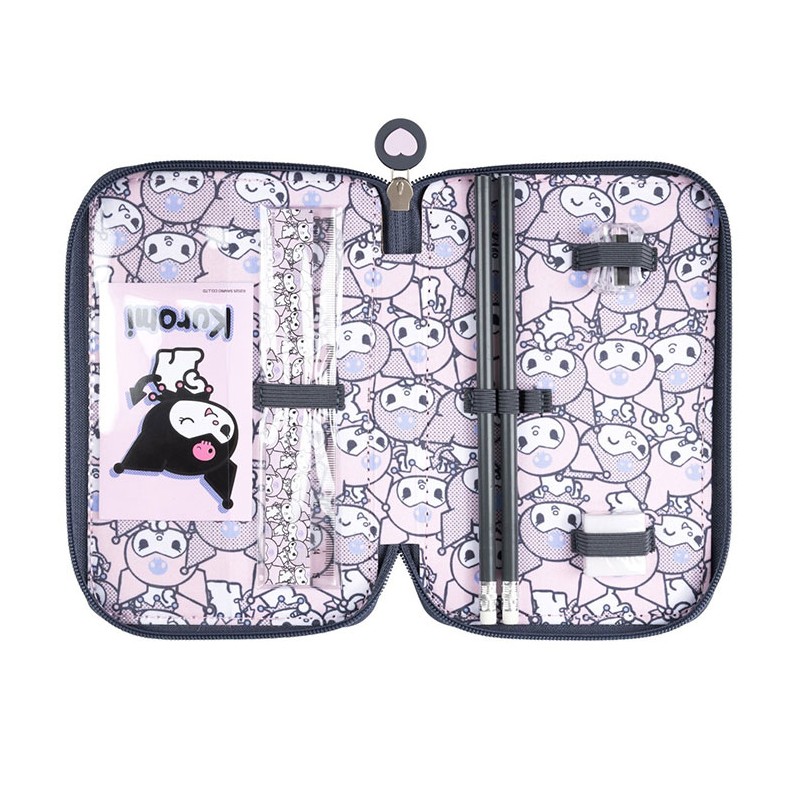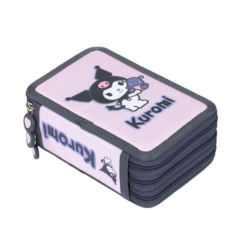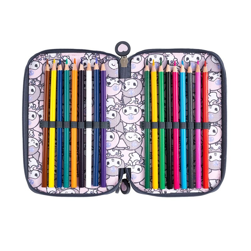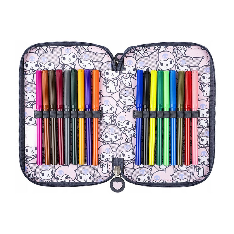 Penar echipat, prevazut cu 3 fermoare, Majewski, Gama St. Right, Colectia Kuromi Pink, un penar compact si spatios. Penarul este realizat dintr-un material textil, de foarte buna calitate, rezistent si impermeabil. Penarul este prevazut cu trei compartimente si dispune de o capacitate mare de echipare, oferind suficient spatiu pentru diverse rechizite. Penarul este echipat cu urmatoarele re-chizite: 1 rigla de 15 cm, 1 radiera, 1 ascutitoare, 9 carioci, 9 linere, 18 creioane colorate, 2 creioane grafit, 2 pixuri, 1 compas, 1 echer, 1 raportor si 1 orar. Fermoarele penarului sunt rezistente, dotate cu o zona de prindere cauciucata si profilata, pentru prindere usoara. Dimensiunile penarului sunt urmatoarele: 20x13x6 cm.