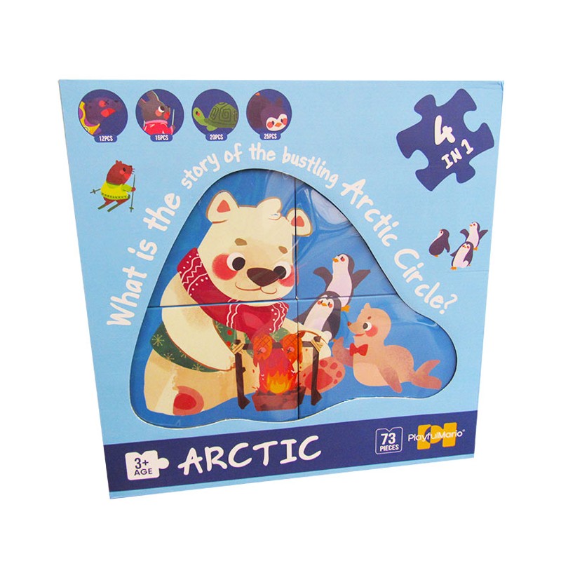 Orice copil care iubeste puzzle-urile va fi incantat sa asambleze acest puzzle deosebit cu 73 piese, care ilustreaza scene din mediul arctic. Acesta nu este doar un simplu puzzle care trebuie asamblat. Copiii se vor bucura de ore intregi de distractie, deoarece cutia contine un numar de 4 puzzle-uri diferite, formate din 12, 16, 20, respectiv 25 piese. Descoperind combinatiile corecte dintre piesele de puzzle, copiii vor reusi sa isi insuseasca o serie de cunostinte de baza, necesare varstei lor. Ilus-tratiile prietenoase si culorile vibrante capteaza interesul si atentia copiilor, stimuleaza abilitatile lor de identificare, asociere si asamblare, si dezvolta gandirea logica, imaginatia si creativitatea. Contine piese mici detasabile. Produsul nu este recomandat copiilor sub 3 ani.