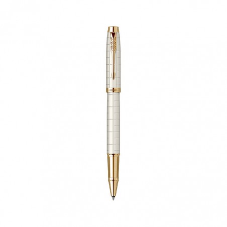 Roller Parker IM Royal Premium alb cu accesorii aurii, un roller ce face parte din gama IM Royal Premium. Gama Royal, lansata in anul 2016 pe piata britanica, reprezinta gama clasica refrisata cu elemente decorative, finisaje si ambalaje noi. Aceasta gama combina in mod natural functionali-tatea cu eleganta, oferind o experienta aparte plina de incredere si de confort la scriere. Forma sa moderna se defineste prin linii clasice drepte, simple, bine conturate, ce incanta ochiul inca de la prima vedere. Fara rezerve, Parker IM Premium se prezinta ca un "scriitor" modern, simplu, fiabil si de calitate. Forma sa moderna, definita de linii clasice drepte si bine conturate, incanta simturile inca de la prima vedere. Fiecare detaliu, de la eleganta lucioasa a finisajelor la rafinamentul textur-ii cizelate pe corp si capac, este conceput pentru a rasfata simturile tactile si vizuale ale utiliza-torului. Rollerul are corpul realizat din aluminiu gravat laser cu model cross line, lacuit cu lac alb perlat. Rollerul functioneaza cu rezerva standard pentru roller cu cerneala si contine o rezerva pentru roller Parker. Rollerul este prevazut cu un grip realizat din alama cizelat cu model brushed, placat cu aur 23K. Capacul rollerului este realizat din aluminiu gravat laser cu model cross line, lacuit cu lac alb perlat. Capacul se inchide prin apasare. Accesoriile rollerului sunt realizate din alama placate cu placat cu aur 23K. Rollerul este dotat cu un clips din otel inoxidabil, placat cu aur de 23K. Rollerul se livreaza ambalat in cutie de cadou, si poate reprezenta un cadou ideal pentru orice ocazie.