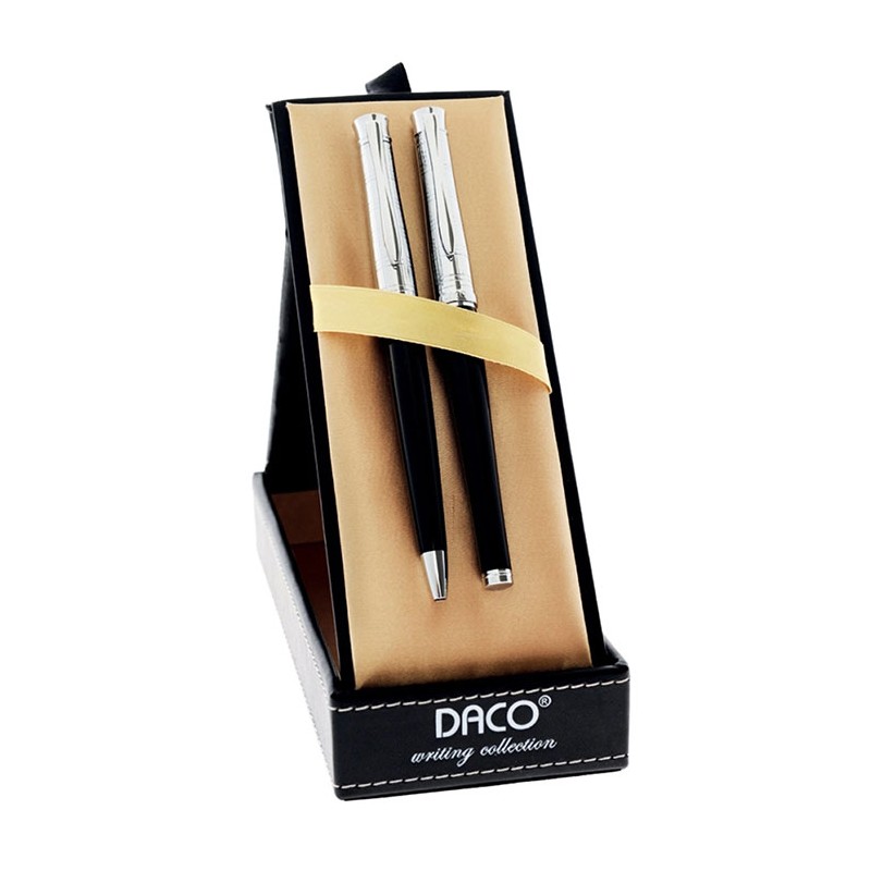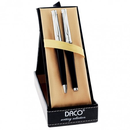 Set alcatuit din pix si stilou metalic, intr-un design simplu, deosebit de elegant. Instrumentele de scris au corpul metalic de culoare negru lucios cu decoratii argintii. Pixul se actioneaza prin rasucire si contine o rezerva tip Parker, cu o grosime a mine de 1 mm. Stiloul functionaza cu patroane standard de cerneala. Penita stiloului este deosebit de rezistenta, realizata din iridium, de grosime F. Instrumentele de scris sunt ambalate intr-o cutie de cadou, cu design inovativ. Cumpara-l pentru tine sau daruieste-l cadou unei persoane dragi.