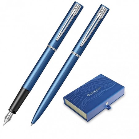 Set pix+stilou Waterman Allure albastru cu accesorii cromate, un set ce face parte din Colectia Allure de la Waterman. Intr-un univers al rafinamentului si al elegantei fara cusur, Waterman ne introduce intr-o poveste captivanta cu gama Allure. Aceste instrumente de scris nu sunt doar sim-ple accesorii, ci un tribut adus frumusetii si complexitatii Parisului. Fiecare proprietar al unui Wa-terman Allure va simti ca detine o mica parte din inima vibranta a orasului luminilor – o esenta ce reuneste cultura, arta, istoria si romantismul parizian. Faurite cu maiestrie la Centrul de Excelenta Waterman din Nantes, Franta, instrumentele de scris Allure sunt opere de arta moderne. Fiecare linie si curba a acestor instrumente de scris este o declaratie de stil si sofisticare, menita sa impre-sioneze si sa inspire. Corpul pixului este realizat din alama lacuit cu lac albastru metalizat. Pixul este prevazut cu un mecanism ce se actioneaza prin apasare (click) si contine o rezerva Waterman. Clipul pixului este din otel inoxidabil placat cu crom. Stiloul are corpul realizat din alama lacuit cu lac albastru metalizat. Capacul este realizat din alama lacuit cu lac albastru metalizat. Capacul se inchide prin apasare. Stiloul este prevazut cu un grip din ABS de culoare neagra. Penita stiloului este realizata din otel inoxidabil, placata cu crom, avand in varf pastila de iridiu. Stiloul func-tioneaza atat cu cartuse, cat si cu convertor. Setul de pix si stilou se livreaza impreuna cu o cutie dubla de cadou. Astfel acest cadou va ramane cu siguranta in memoria celor carora le va fi daruit.