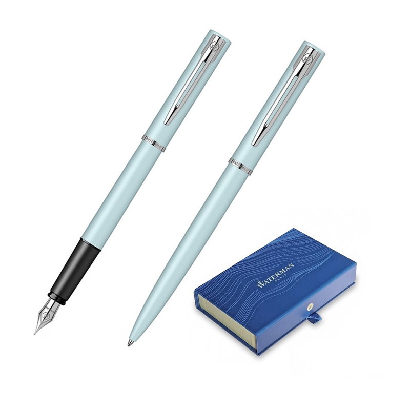 Set pix si stilou Waterman Allure albastru pastel cu accesorii cromate, in cutie dubla de cadou