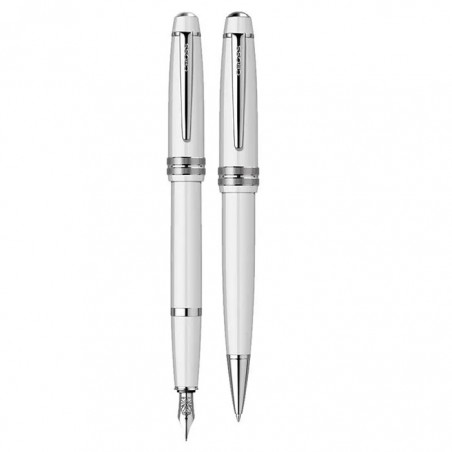 Set pix+stilou Cross Bailey Light alb lucios cu accesorii cromate, un set ce face parte din Colectia Bailey de la Cross, ce se evidentiaza printr-un raport valoare-pret-calitate exceptional. Aceste in-strumente de scris sunt elegante, cu un profil traditional, bine echilibrat, bine conturat, intr-o se-lectie de finisaje sofisticate superbe, in culori clasice vibrante, lucioase. Stilul modern executiv, cat si design-ul traditional dublat de rafinament si eleganta, surprinde placut utilizatorul. Linia subtila ce contureaza corpul este accentuata de un inel central cu taietura adanca ce scoate in evidenta personalitatea distincta a gamei Bailey. Prietenul "scriitor" Bailey poate fi considerat pe buna dreptate o articulatie cotidiana, o extensie a gandurilor ce dorim sa le punem pe hartie, o unealta de zi cu zi ce ne serveste fara pretentii in toate cele ce tin de scris. Cele doua instrumente de scris au corpul realizat din rasina ABS de culoare alb lucios, iar accesoriile sunt realizate din alama placate cu crom. Pixul este prevazut cu un mecanism ce se actioneaza prin rasucire (twist) si contine o rezerva Cross Slim. Clipul pixului este din otel inoxidabil tip arc, placat cu crom. Stiloul este prevazut cu un grip din rasina ABS de culoare alb lucios. Penita stiloului este realizata din otel in-oxidabil, placata cu crom, avand in varf pastila de iridiu. Stiloul functioneaza atat cu cartuse, cat si cu convertor. Capacul stiloului este realizat din rasina ABS de culoare alb lucios. Capacul se inchide prin apasare. In cazul in care doriti sa faceti un cadou calitativ nepretentios, un cadou prie-tenos si plin de impact emotional, va recomandam fara ezitare intrumentele de scris din gama Bai-ley.