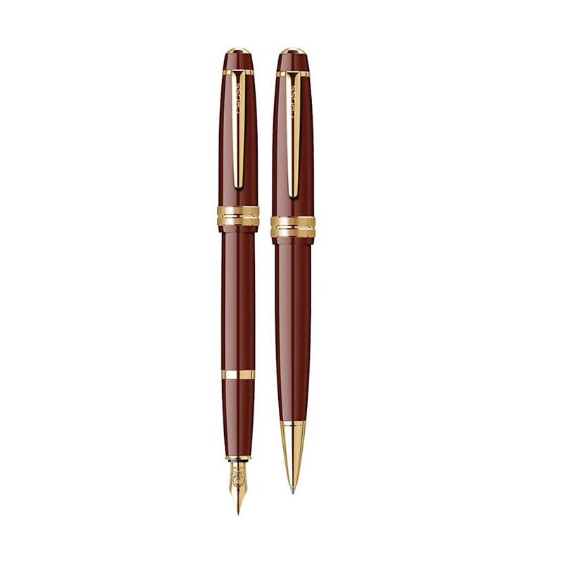 Set pix+stilou Cross Bailey Light burgundy lucios cu accesorii aurii, un set ce face parte din Colec-tia Bailey de la Cross, ce se evidentiaza printr-un raport valoare-pret-calitate exceptional. Aceste instrumente de scris sunt elegante, cu un profil traditional, bine echilibrat, bine conturat, intr-o se-lectie de finisaje sofisticate superbe, in culori clasice vibrante, lucioase. Stilul modern executiv, cat si design-ul traditional dublat de rafinament si eleganta, surprinde placut utilizatorul. Linia subtila ce contureaza corpul este accentuata de un inel central cu taietura adanca ce scoate in evidenta personalitatea distincta a gamei Bailey. Prietenul "scriitor" Bailey poate fi considerat pe buna dreptate o articulatie cotidiana, o extensie a gandurilor ce dorim sa le punem pe hartie, o unealta de zi cu zi ce ne serveste fara pretentii in toate cele ce tin de scris. Cele doua instrumente de scris au corpul realizat din rasina ABS de culoare burgundy lucios, iar accesoriile sunt realizate din alama placate cu aur. Pixul este prevazut cu un mecanism ce se actioneaza prin rasucire (twist) si contine o rezerva Cross Slim. Clipul pixului este din otel inoxidabil tip arc, placat cu aur. Stiloul este prevazut cu un grip din rasina ABS de culoare burgundy lucios. Penita stiloului este realizata din otel inoxidabil, placata cu aur de 23K, avand in varf pastila de iridiu. Stiloul functioneaza atat cu cartuse, cat si cu convertor. Capacul stiloului este realizat din rasina ABS de culoare burgundy lu-cios. Capacul se inchide prin apasare. In cazul in care doriti sa faceti un cadou calitativ nepretenti-os, un cadou prietenos si plin de impact emotional, va recomandam fara ezitare intrumentele de scris din gama Bailey.