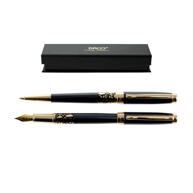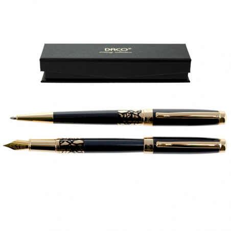 Set alcatuit din pix si stilou metalic de culoare neagra, intr-un design simplu cu model folcloric ce il infatiseaza pe regele Dacilor, Decebal, deosebit de elegant. Instrumentele de scris au corpul metalic de culoare negru sidefat cu ornamente aurii. Pixul se actioneaza prin rasucire si contine o rezerva tip Parker cu grosimea varfului de scris de 1 mm. Stiloul functioneaza cu patroane standard de cerneala. Penita stiloului este deosebit de rezistenta, realizata din iridium, de grosime F. Instrumentele de scris se livreaza ambalate in cutie de cadou de culoare neagra, ce poate fi folosita atat ca penar, cat si pentru o mai buna depozitare. Fie ca esti elev, profesor sau lucrezi in mediul business, setul acesta se potriveste oricui, datorita simplitatii si elegantei pe care le imbina!