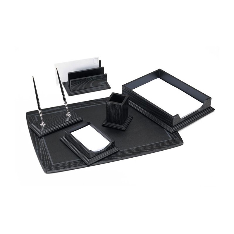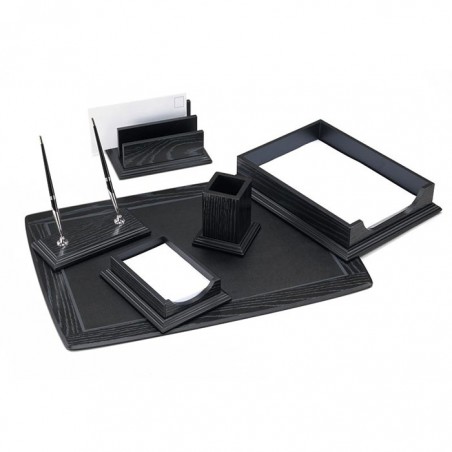 Set de birou din lemn, un model practic si elegant. Setul contine 6 elemente: o tavita pentru docu-mente, un cub de hartie cu suport, un suport pentru plicuri, un suport pentru instrumente de scris, un suport pentru 2 stilouri, o mapa de birou. Dimensiunile mapei de birou sunt urmatoarele: 66x43.5 cm. Setul de birou este disponibil in culoarea neagra.