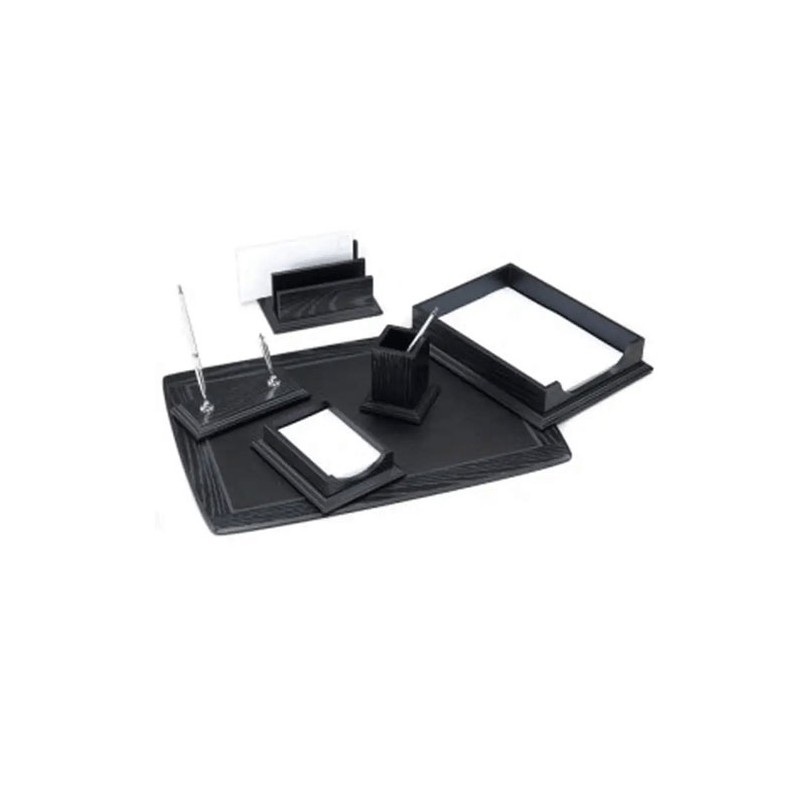 Set de birou, un model practic si elegant. Setul contine 6 elemente: o tavita pentru documente, un cub de hartie cu suport, un suport pentru instrumente de scris, un suport pentru plicuri, un suport pentru 2 stilouri, o mapa de birou.