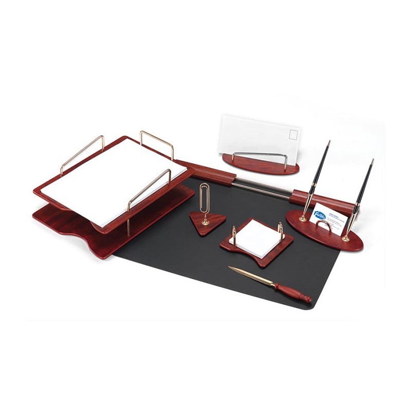 Set de birou din lemn, un model practic si elegant. Setul contine 7 elemente: set compus din 2 tavite pentru documente, un cub de hartie cu suport, un deschizator de plicuri, un suport pentru carti de vizita si stilou, un suport pentru plicuri, un suport pentru capse, o mapa de birou. Dimensiunile mapei de birou sunt urmatoarele: 50x37 cm. Setul de birou este disponibil in culoarea maro.