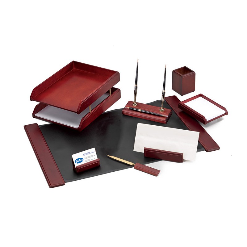 Set de birou din lemn, un model practic si elegant. Setul contine 8 elemente: set compus din 2 tavite pentru documente, un cub de hartie cu suport, un deschizator de plicuri, un suport pentru doua stilouri, un suport pentru plicuri, un suport pentru carti de vizita, un suport pentru instrumente de scris, o mapa de birou. Dimensiunile mapei de birou sunt urmatoarele: 66x43.5 cm. Setul de birou este disponibil in culoarea visiniu.
