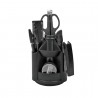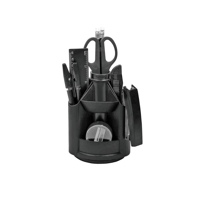 Suport pentru pastrarea accesoriilor de birou, elegant si practic, indispensabil pentru orice birou. Suportul contine urmatoarele articole: un capsator, doua creioane cu radiera, doua pixuri cu mecanism, o foarfeca, un liniar, un cutter, o cutie de capse nr. 10, o radiera, agrafe de birou. Suportul este realizat din material plastic foarte rezistent, de culoare neagra. Suportul este prevazut cu un mecanism cu rotire de 360 grade, pentru a fi mult mai usor de utilizat.