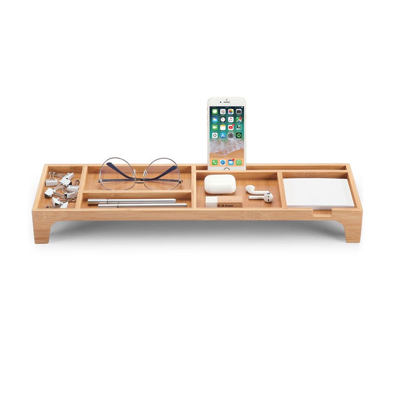 Organizator de birou Forofis 92003, un accesoriu indispensabil pentru pastrarea si organizarea ac-cesoriilor de birou. Prevazut cu 6 compartimente incapatoare, de diferite dimensiuni, organizatorul devine un accesoriu indispensabil pentru mentinerea unui birou curat si ordonat. Organizatorul este realizat din lemn de bambus, fiind astfel deosebit de rezistent, dar avand si un aspect extraordinar de placut. Organizatorul este prevazut cu picioruse (dotate cu material de pasla antiderapant). Astfel, organizatorul permite ca tastatura si mouse-ul sa fie pastrate dedesubt, pentru o mai buna optimizare a spatiului. Organizatorul poate pastra diferite accesorii precum: agrafe de hartie, pixuri, creioane, cuburi de hartie sau notite autoadezive. Dimensiunile organizatorului sunt urmatoarele: 530x150x65 mm.