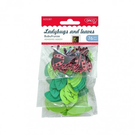 Accesorii craft – Bubufrunze, AD381, un pachet perfect pentru crearea unor proiecte simple sau sofisticate de decoratiune interioara, precum si pentru proiecte de lucru manual. Setul contine un numar de 76 forme din spuma autoadeziva (frunze si buburuze). Acestea vor avea cu siguranta un impact deosebit si vor da o nota interesanta oricarui proiect, sau pot fi folosite pentru a decora pagini de carti de colorat, albume sau alte suprafete.