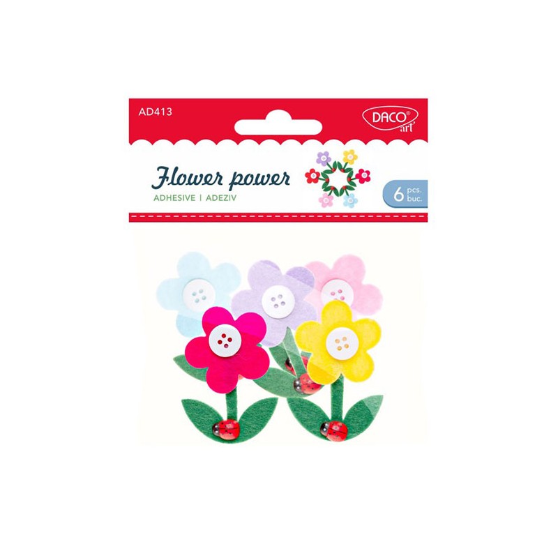Accesorii craft – Flower Power, AD413, un pachet perfect pentru crearea unor proiecte simple sau sofisticate de decoratiune interioara, precum si pentru proiecte de lucru manual. Setul contine un numar de 6 bucati de flori, realizate din fetru autoadeziv, in diverse culori. Acestea vor avea cu siguranta un impact deosebit si vor da o nota interesanta oricarui proiect, sau pot fi folosite pentru a decora pagini de carti de colorat, albume sau alte suprafete.