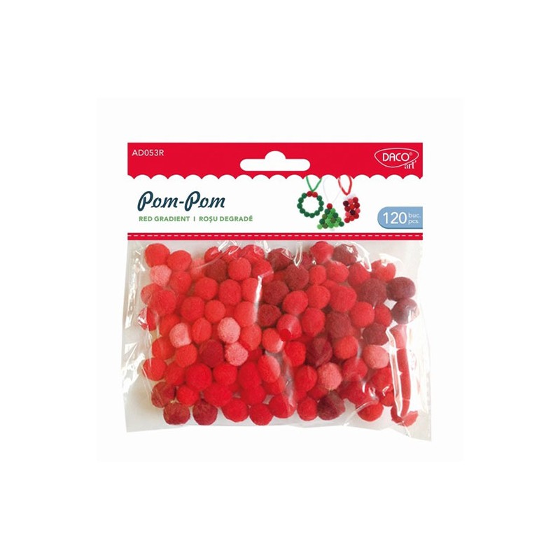 Accesorii craft – Pom Pom rosu degrade, AD053R, un pachet perfect pentru crearea unor proiecte simple sau sofisticate de decoratiune interioara, precum si pentru proiecte de lucru manual. Setul contine un numar de 120 bucati tip pom pom, realizate din material textil, cu dimensiunea de 10 mm, in nuante de rosu. Acestea vor avea cu siguranta un impact deosebit si vor da o nota interesanta oricarui proiect, sau pot fi folosite pentru a decora pagini de carti de colorat, albume sau alte suprafete.