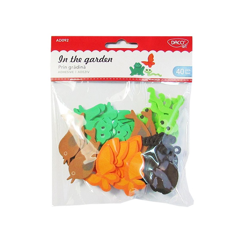 Accesorii craft – Prin gradina, AD092, un pachet perfect pentru crearea unor proiecte simple sau sofisticate de decoratiune interioara, precum si pentru proiecte de lucru manual. Setul contine un numar de 40 forme din spuma autoadeziva, de dimensiuni si culori diferite, in forme de animale. Acestea vor avea cu siguranta un impact deosebit si vor da o nota interesanta oricarui proiect, sau pot fi folosite pentru a decora pagini de carti de colorat, albume sau alte suprafete.