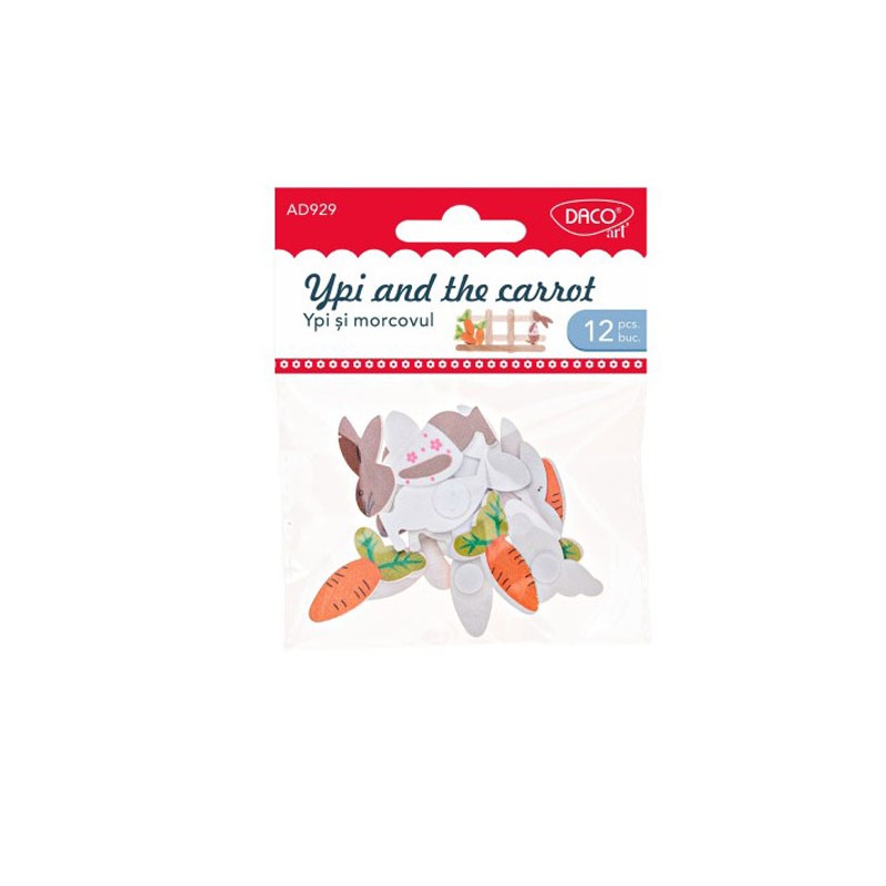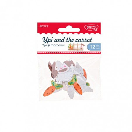 Accesorii craft – Ypi si morcovul, AD929, un pachet perfect pentru crearea unor proiecte simple sau sofisticate de decoratiune interioara si crafturi, precum si pentru proiecte de lucru manual. Setul contine un numar de 12 forme din lemn, sub forma de iepure (4.2 cm) si morcov (3.5 cm). Acestea vor avea cu siguranta un impact deosebit si vor da o nota interesanta oricarui proiect sau decoratiune.