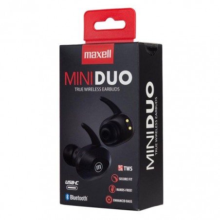 Casti in ureche, cu microfon, Bluetooth Mini Duo Maxell vin impreuna cu o cutie pentru incar-care. Castile au in dotare 3 perechi de dopuri cu dimensiuni diferite, pentru un confort maxim. Functie de hands-free cu ajutorul microfonului incorporat pentru a oferi siguranta in timpul depla-sarii. Culoare: negre. Indicator LED pentru nivelul de incarcare casti. Nivel bas imbunatatit. Im-pedanta: 16Ω. Raspuns in frecventa: 20Hz-20KHz. Sensibilitate: 98 + -3dB. Versiune bluetooth v5.0. Cablu de incarcare micro USB. Raza de actiune bluetooth: 10 m. Dimensiunea difuzorului: 10 mm. Baterie reincarcabila cu litiu cu durata de viata de aproximativ 6 ore. Timp de incarcare: 1,5 ore castile iar cutia ce le contine 1.5 ore. Termenul de garantie este de 24 de luni de la data cumpararii produsului.